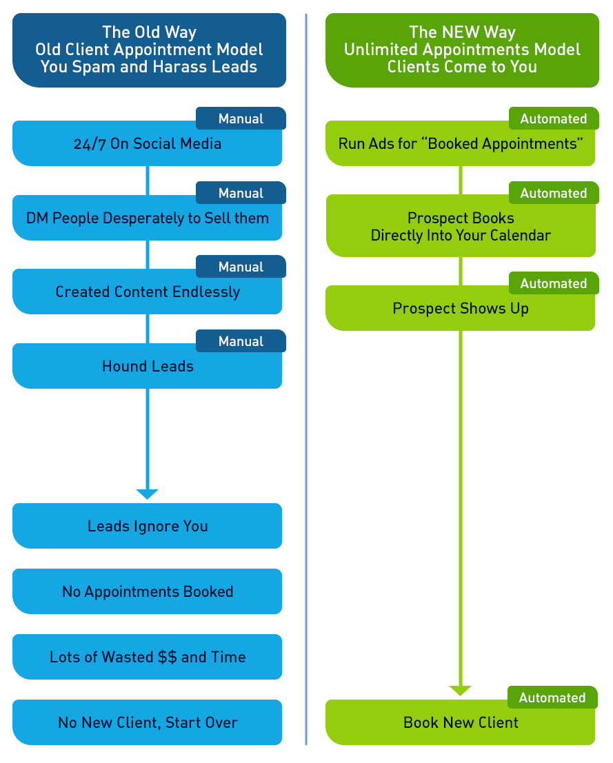 Unlimited Appointments is a counterintuitive approach to filling your sales pipeline with high value prospects appointments booked directly into your calendar, that allows you to get more clients without social media advertising, dealing with troll commenters, cold calling, or begging for referrals.
